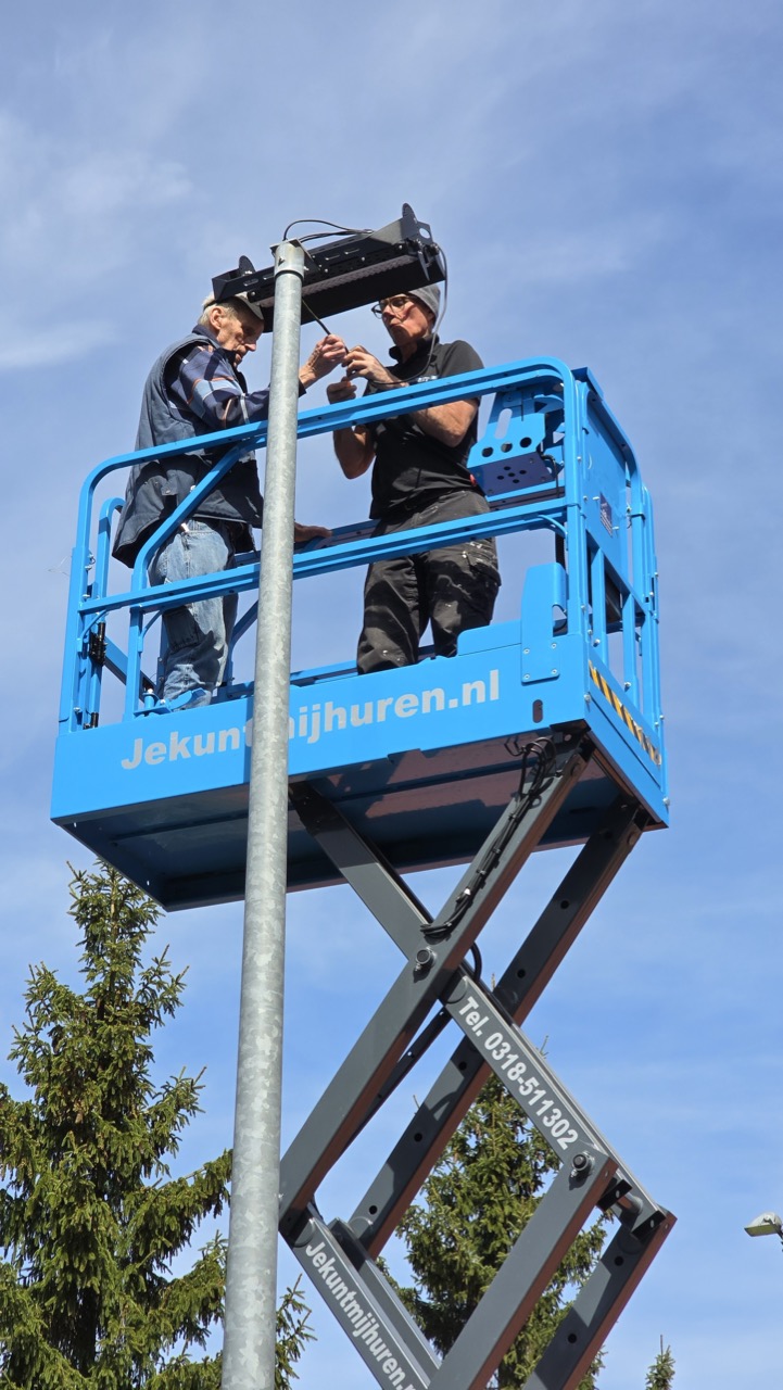 14 april 2026 – RedactieAfgelopen woensdag 8 april was het, na maanden van voorbereiding dan zover: de nieuwe baanverlichting werd geïnstalleerd. En dat had nogal wat voeten in de aarde want de masten zijn 7 meter hoog en daarom was er een hoogwerker gehuurd om het werk veilig uit te kunnen voeren.